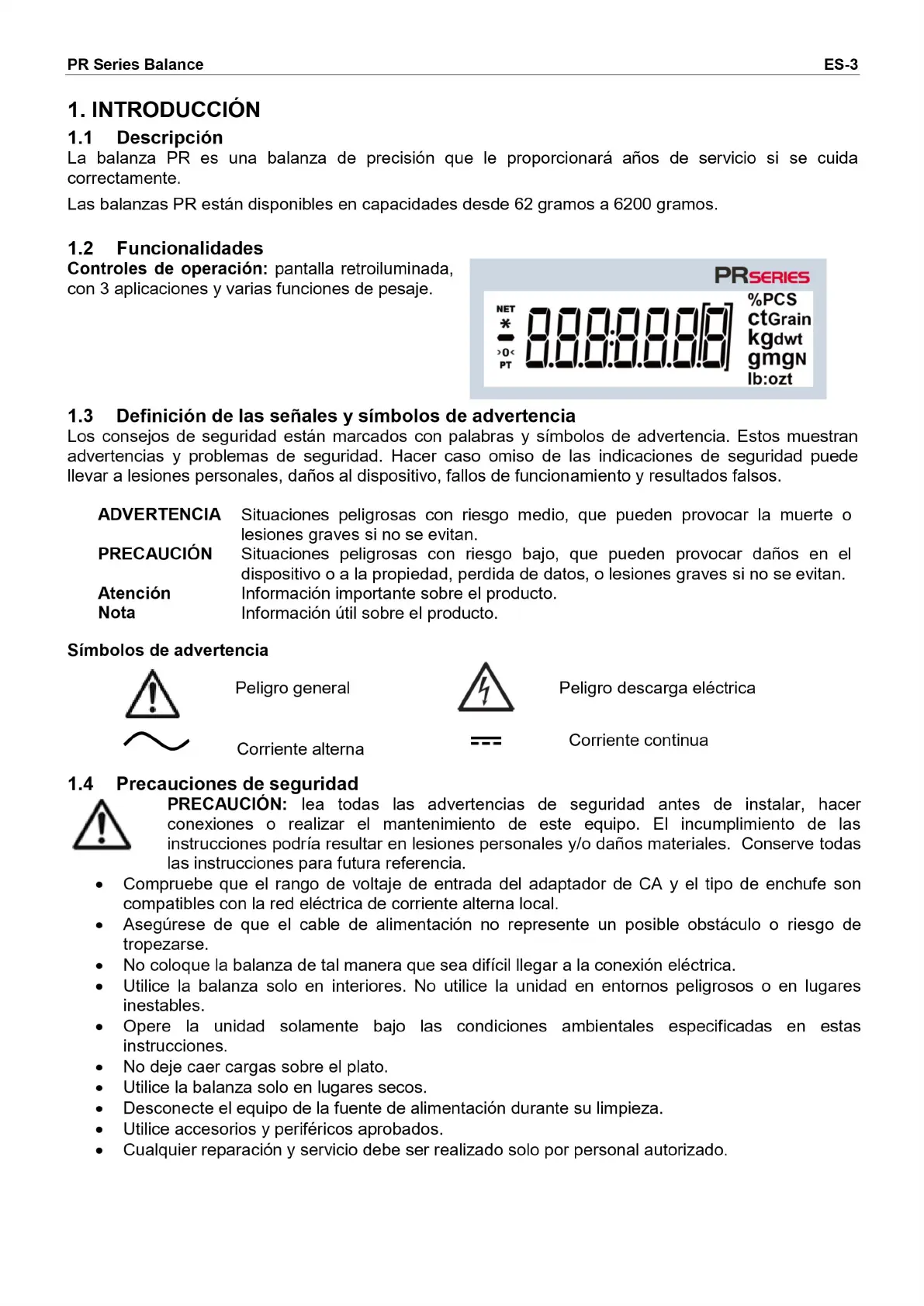 OHAUS PR2202/E - Definición de las Señales y Símbolos de Advertencia; Descripción; Funcionalidades; Introducción