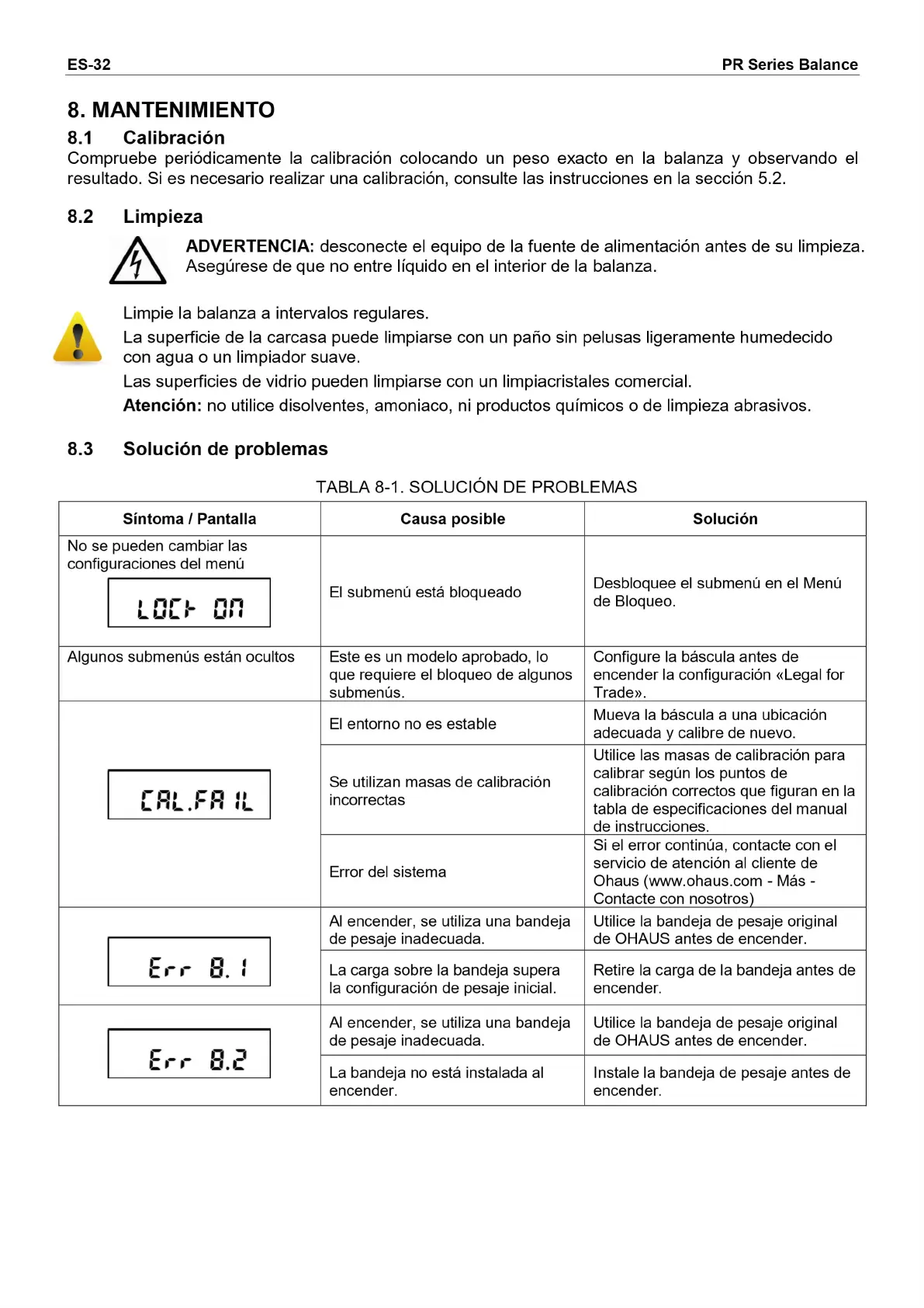 OHAUS PR4202/E - Limpieza; Mantenimiento; Solución de Problemas