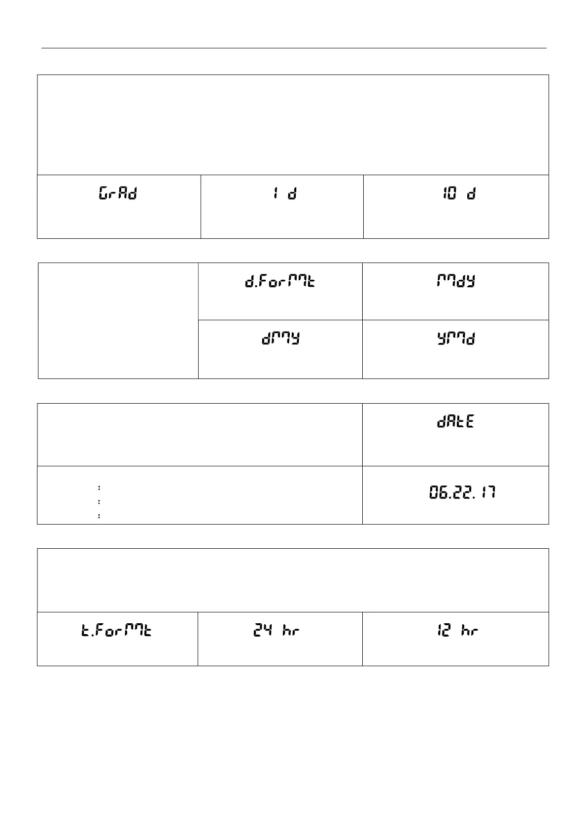 OHAUS PR523/E - Date Format (Formato de Fecha); Date Setup (Configuración de Fecha); Graduations (Divisiones); Time Format (Formato de Hora)