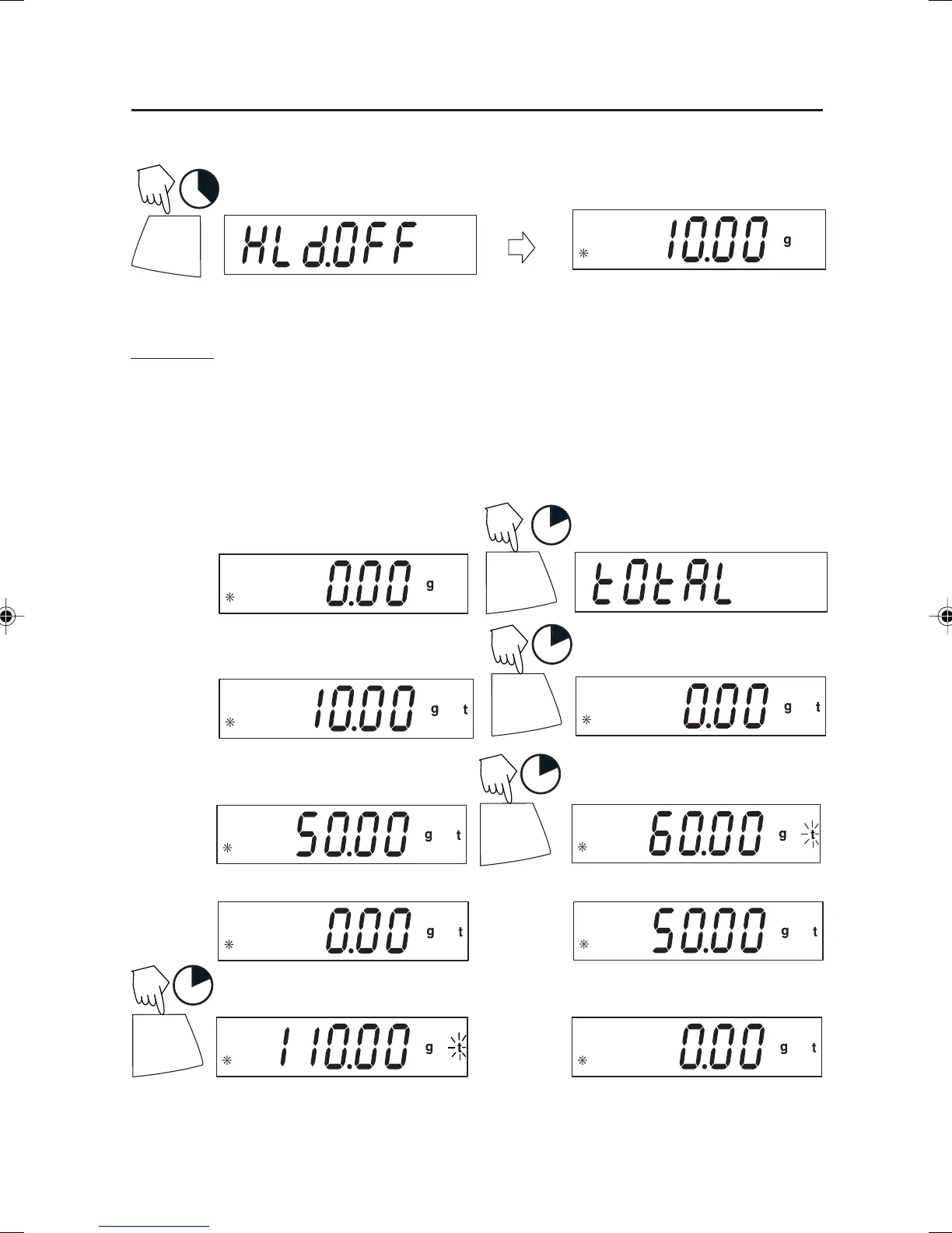t y la unidad actual, por ejemplo (g). Cuando se muestra el peso total, el indicador