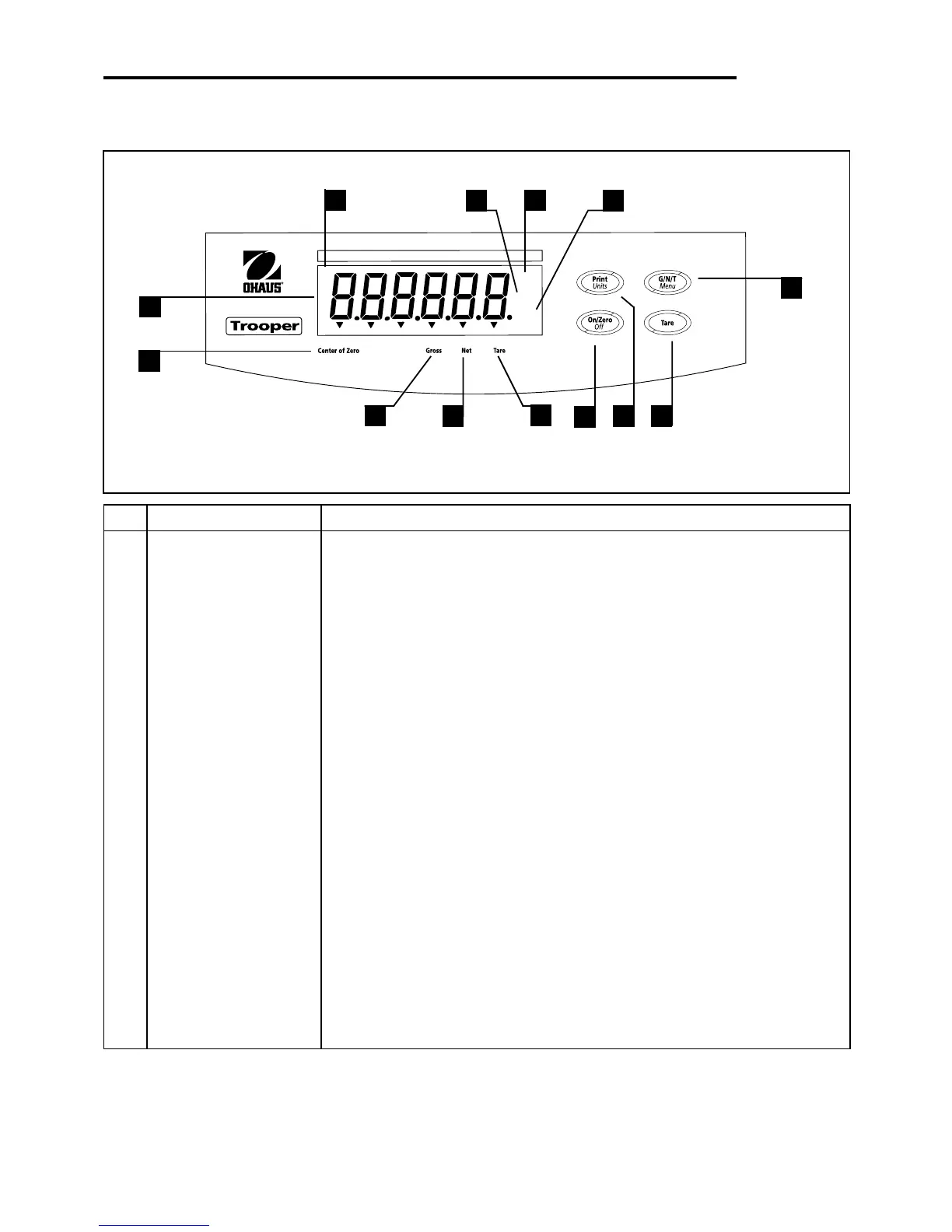 7 Print/Units button Short press, prints data which is displayed on the Scale.