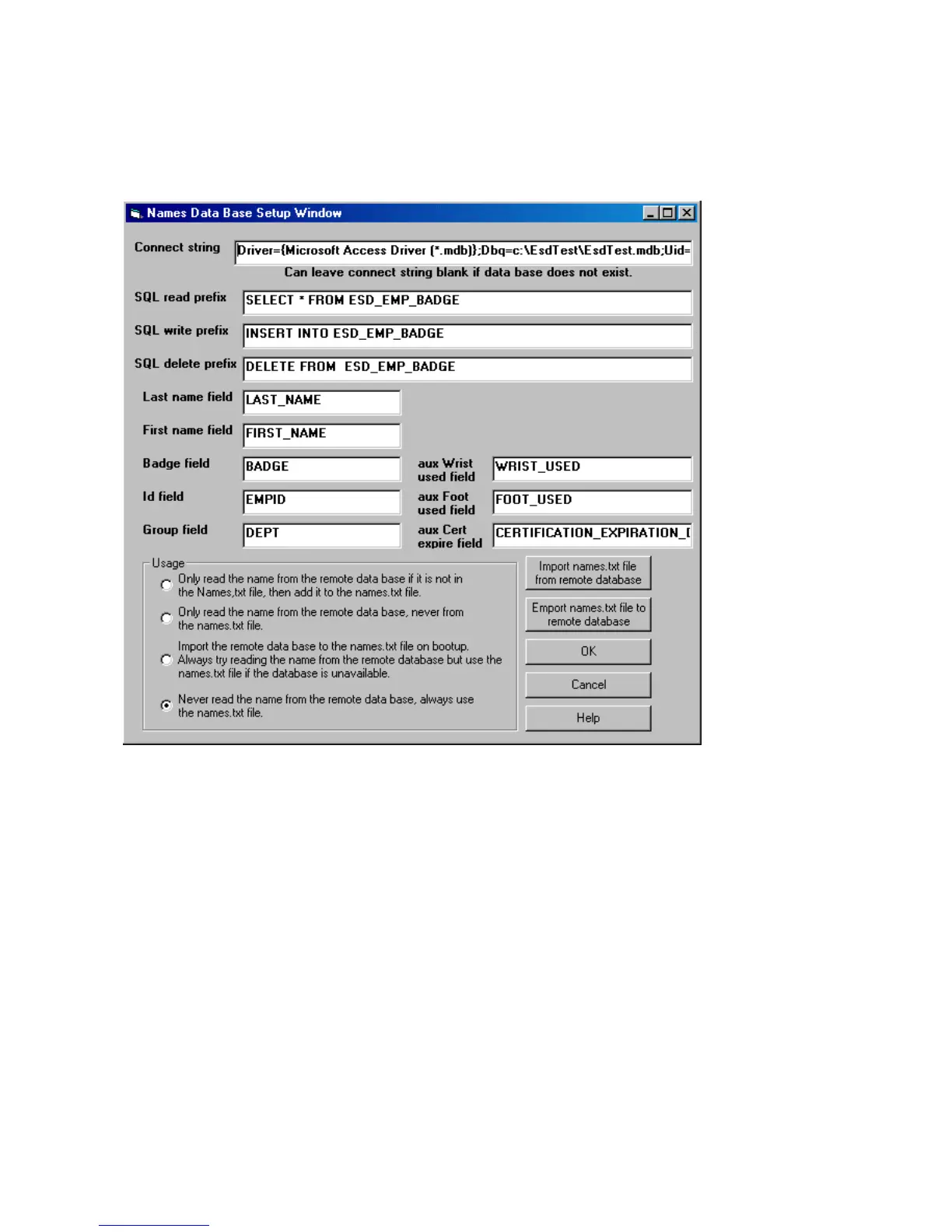 Click Setup, Remote data base of names to open the setup window and enter the following items: