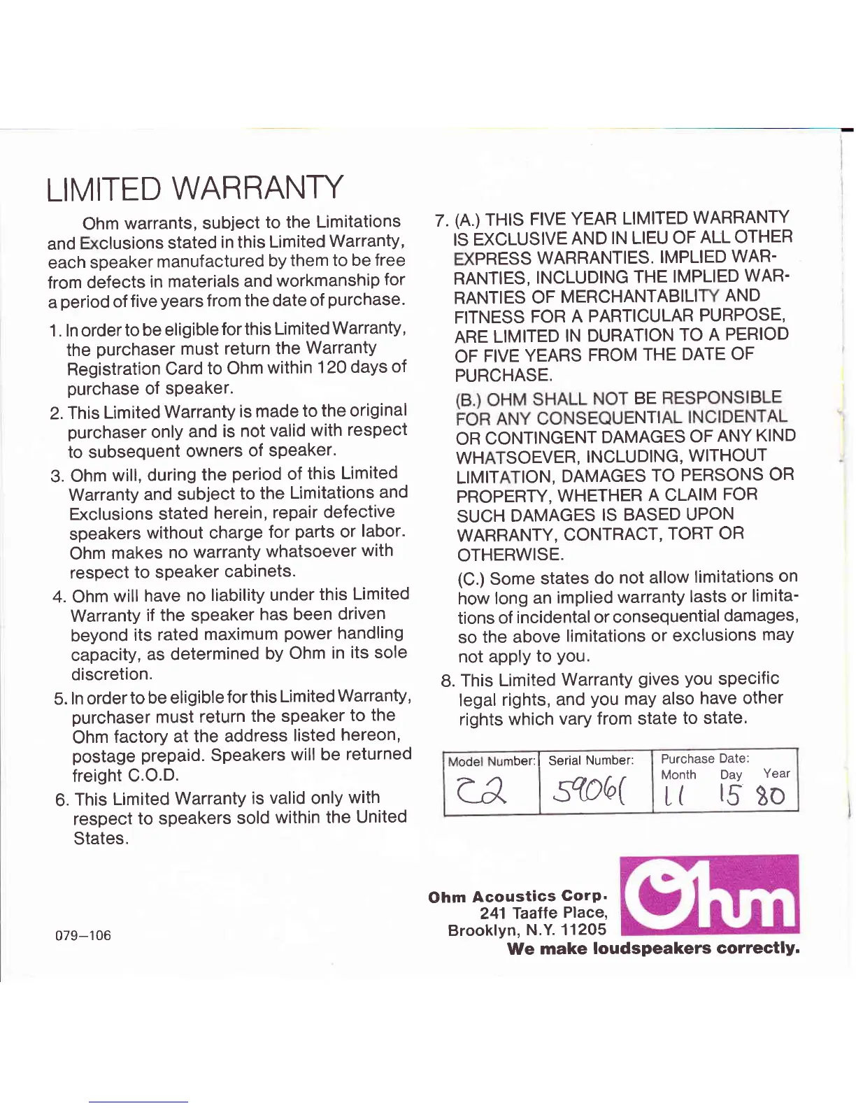 OHM C2 - LIMITED WARRANTY; Warranty Eligibility and Terms; Warranty Disclaimer and Limitations; Legal Rights and Specific Clauses