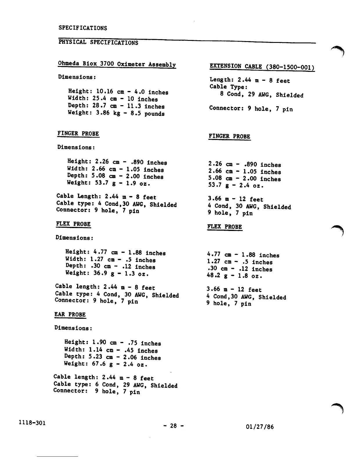 Ohmeda Biox 3700 - Specifications; Physical Specifications