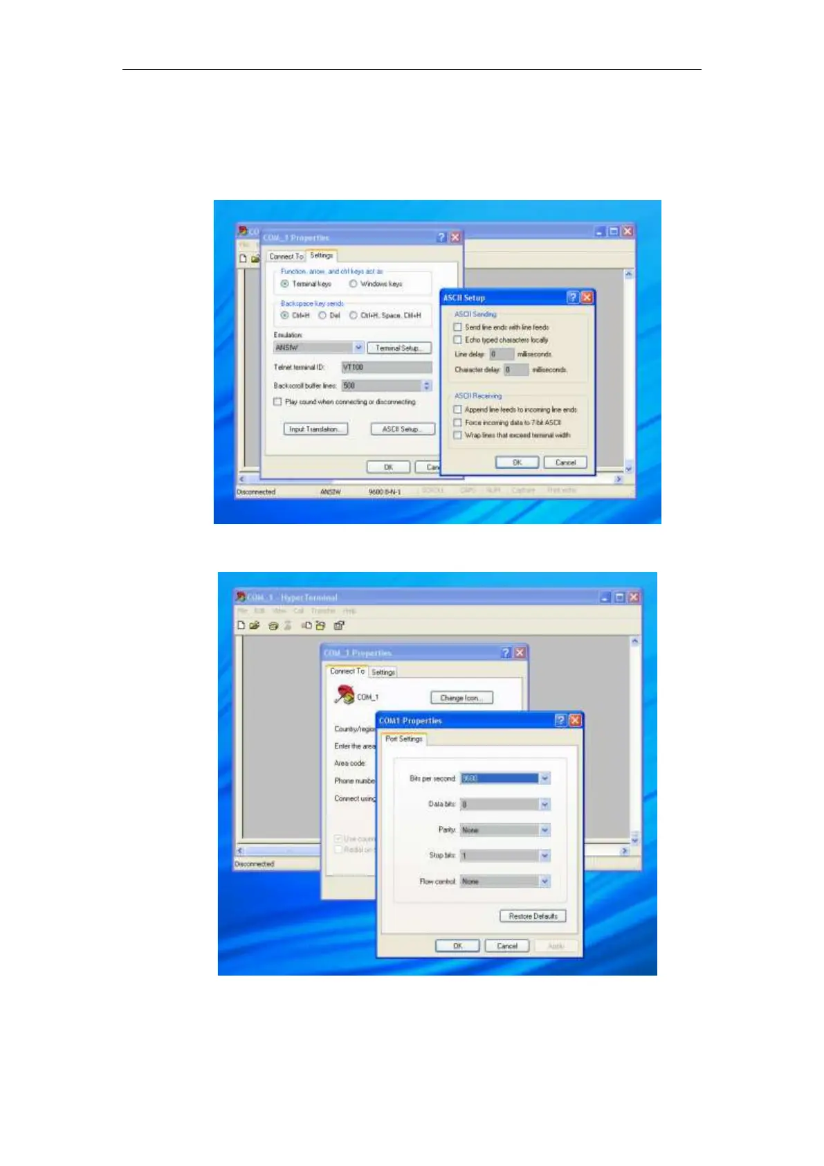 ohmex SONARMITE - Typical Windows HyperTerminal settings; Hyperterminal ASCII settings; Hyperterminal Connection settings