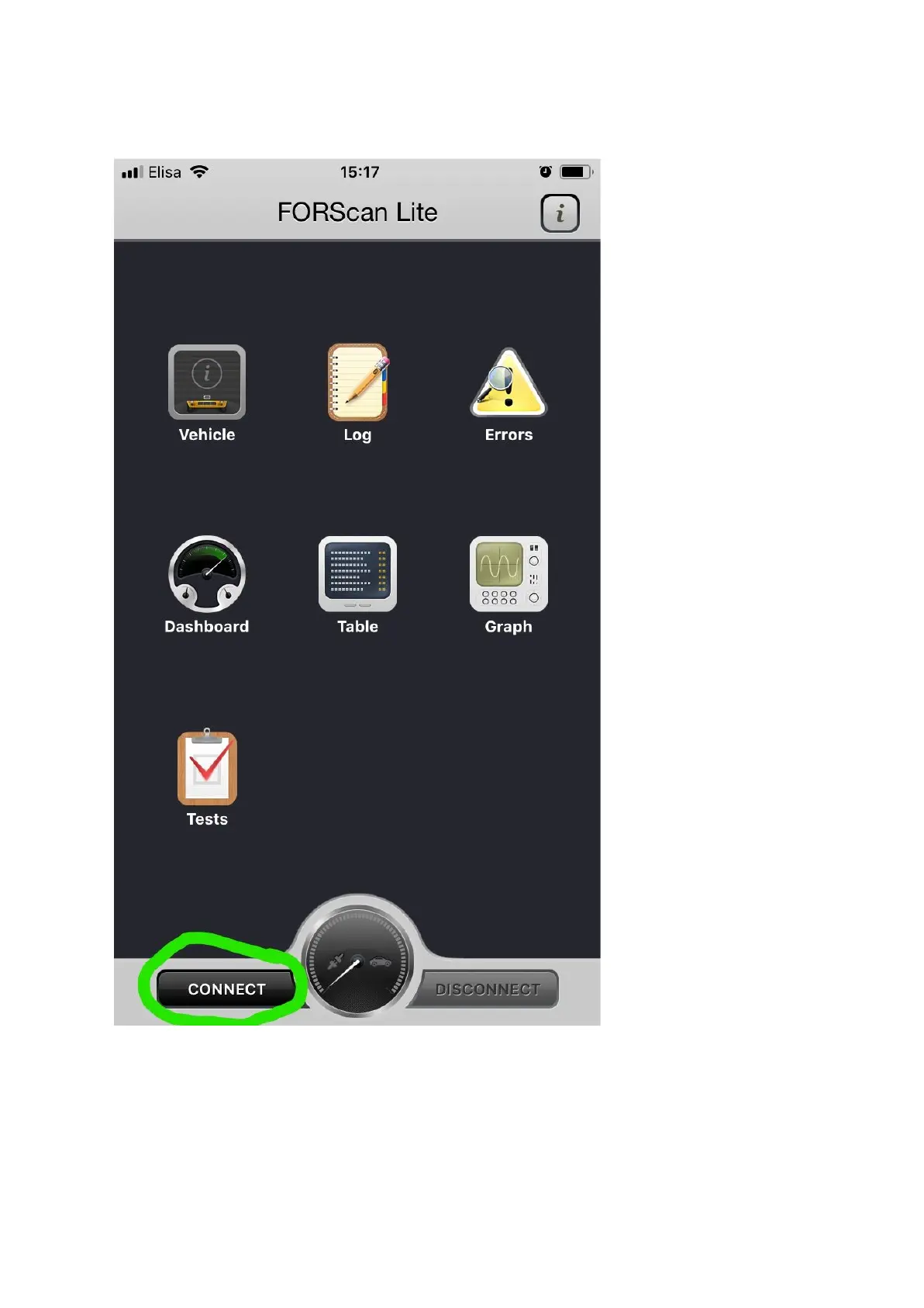 5. Using the FORScan Lite phone app, push connect to the vehicle.