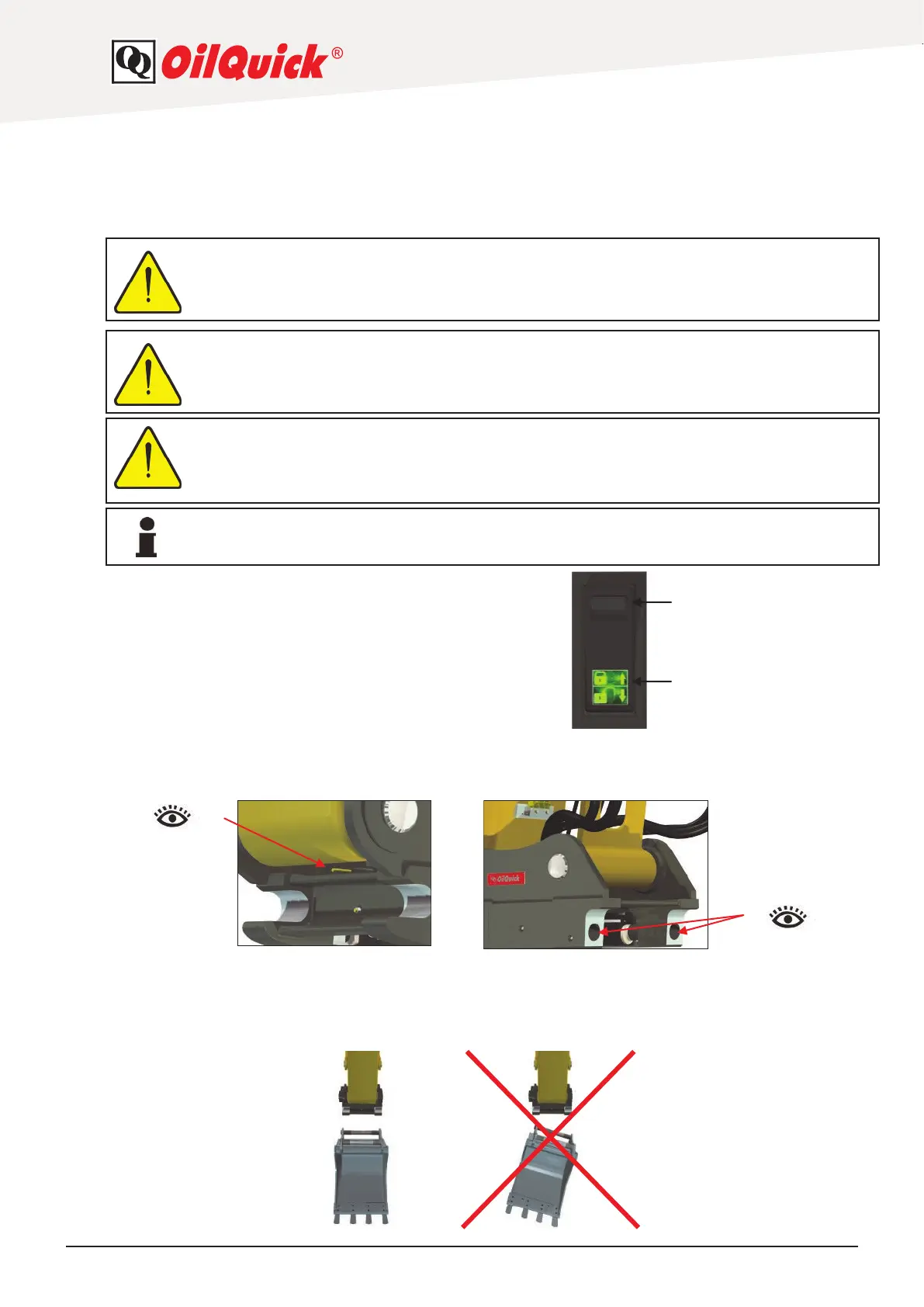 In the descriptions regarding handling of the quick coupler, we have assumed that an OilQuick locking
