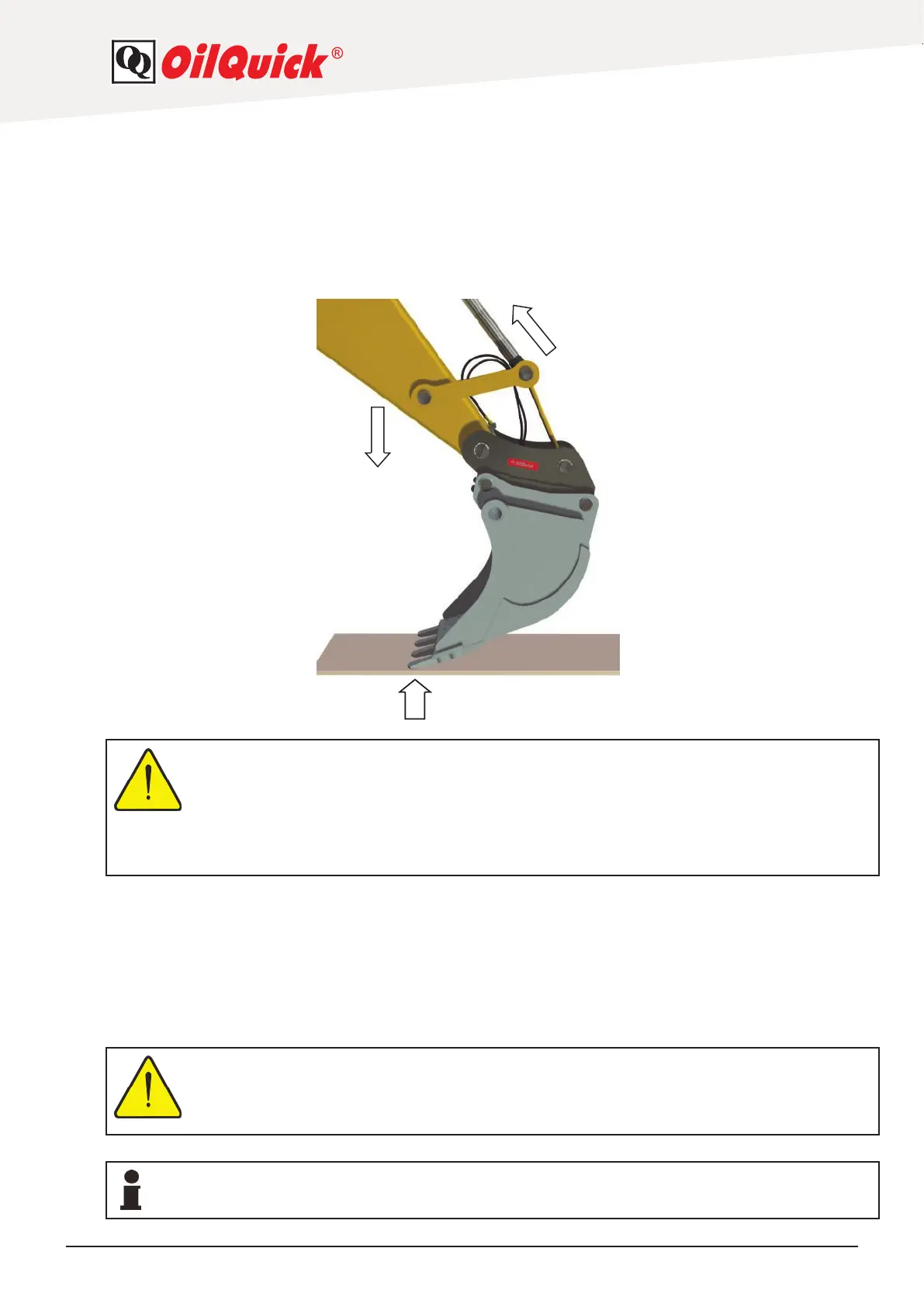 In the descriptions regarding handling of the quick coupler, we have assumed that an OilQuick locking