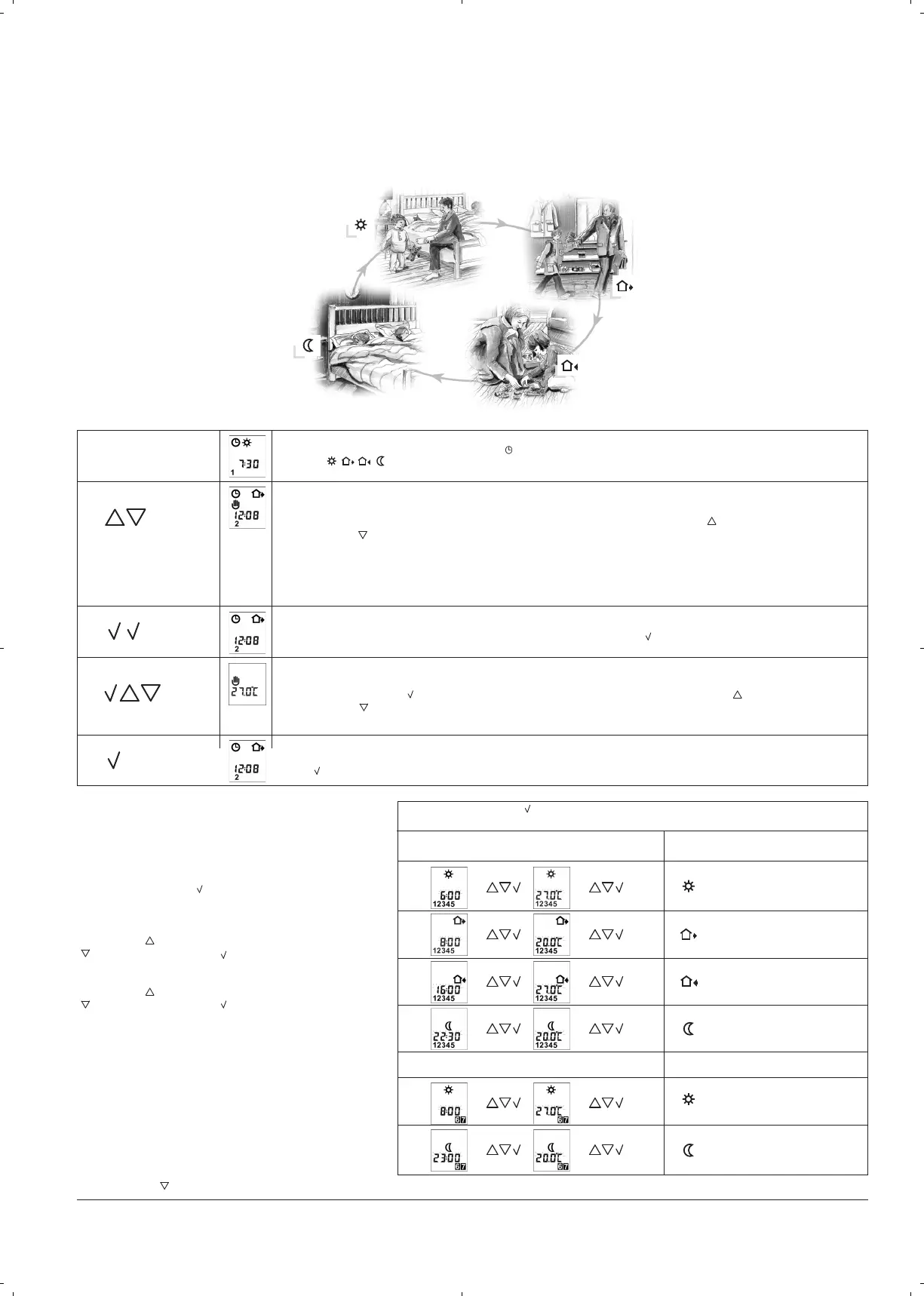автоматически устанавливает необходимую температуру в заданное время. Обычно термостат настраивается на 5 дней с 4 периодами и 2
