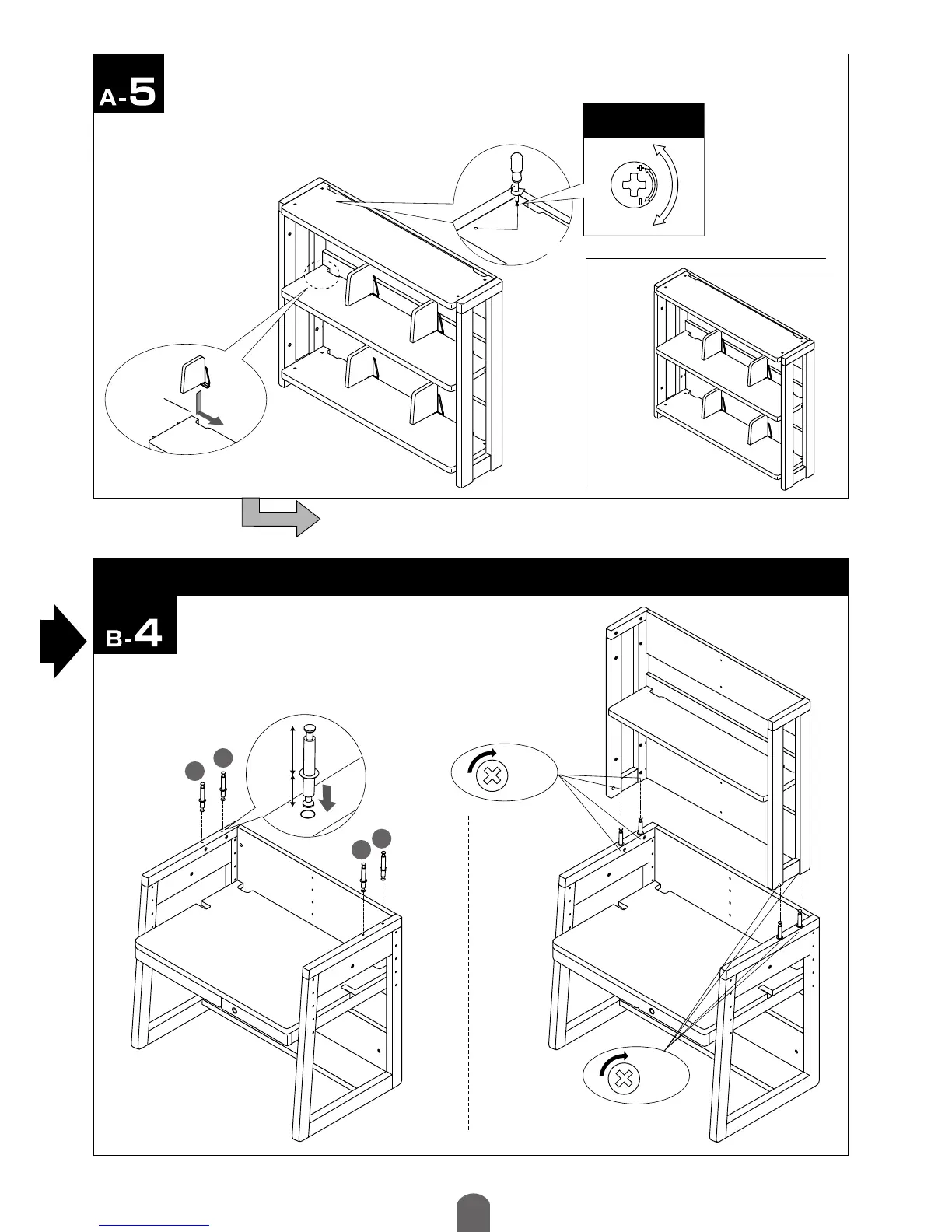 Connection of desk completed on Page 6 and bookshelf
