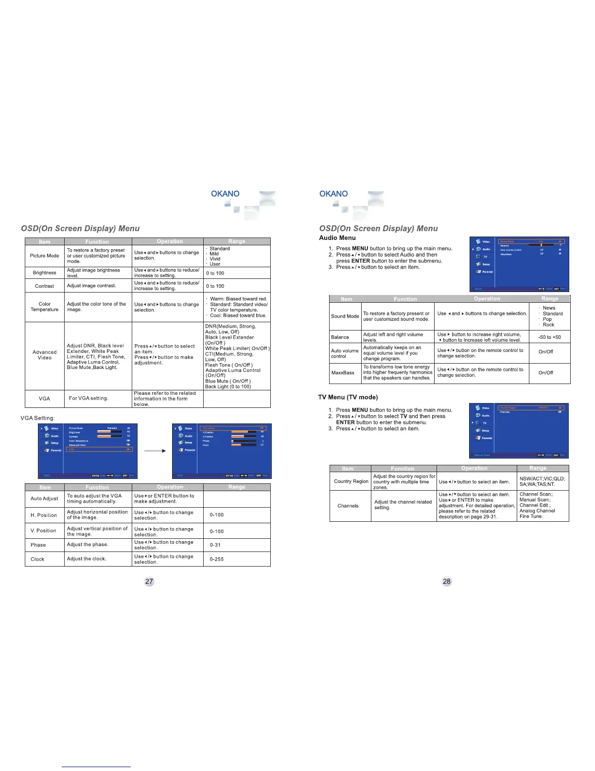 Okano LTV3201C - Audio Menu; TV Menu; VGA Setting