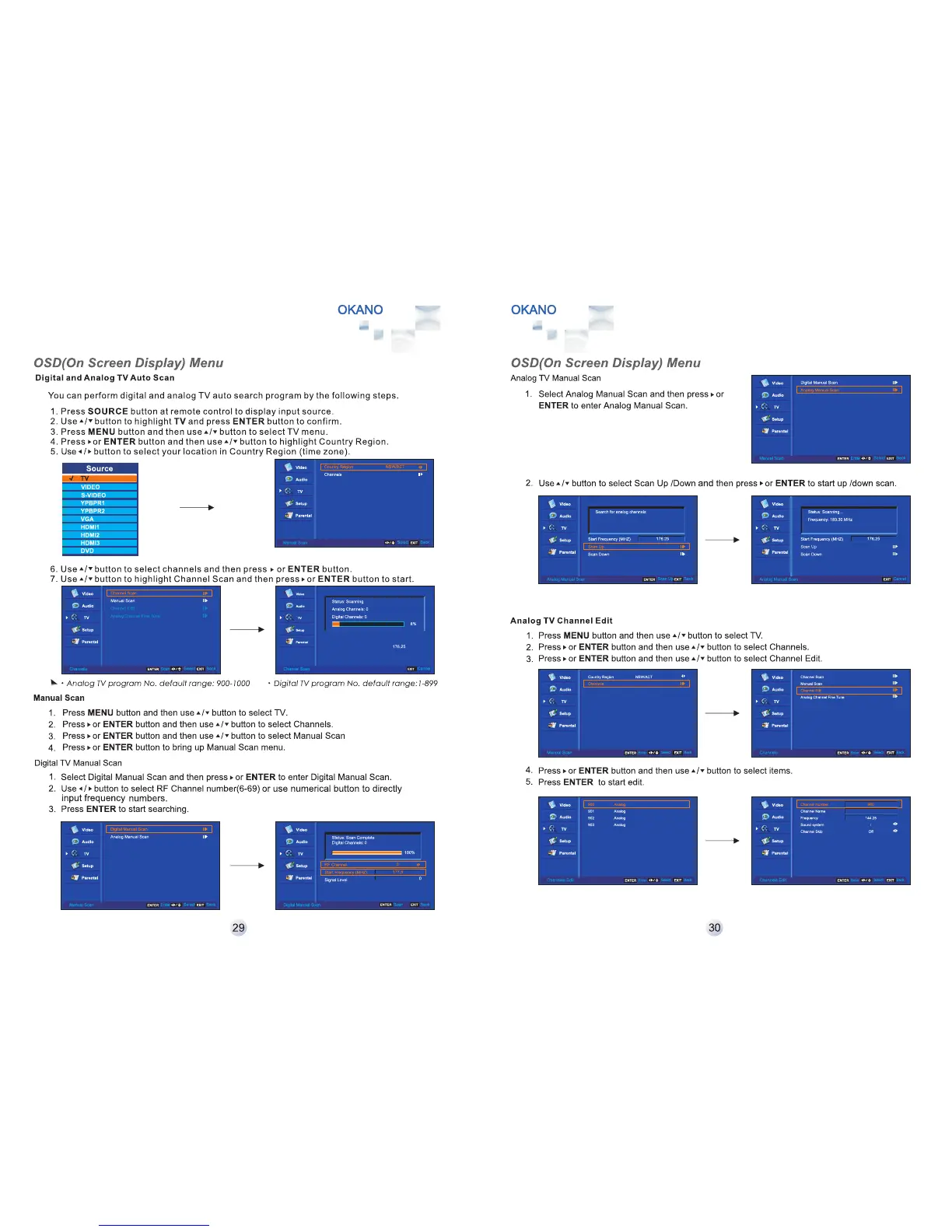 Okano LTV3201C - Digital and Analog TV Auto Scan; Manual Scan; Analog TV Manual Scan; Analog TV Channel Edit