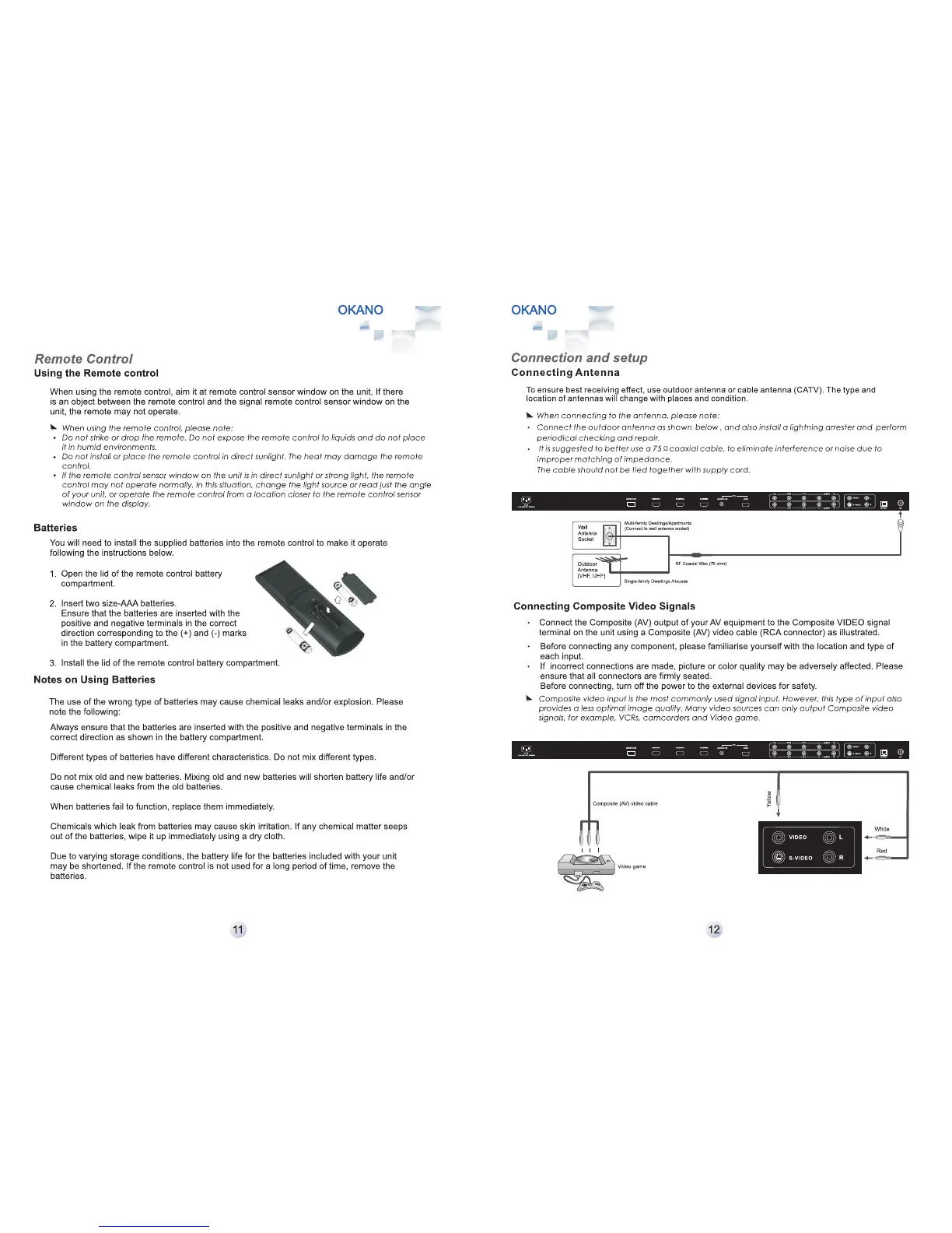 Okano LTV3201C - Connection and Setup; Using the Remote Control; Batteries; Notes on Using Batteries