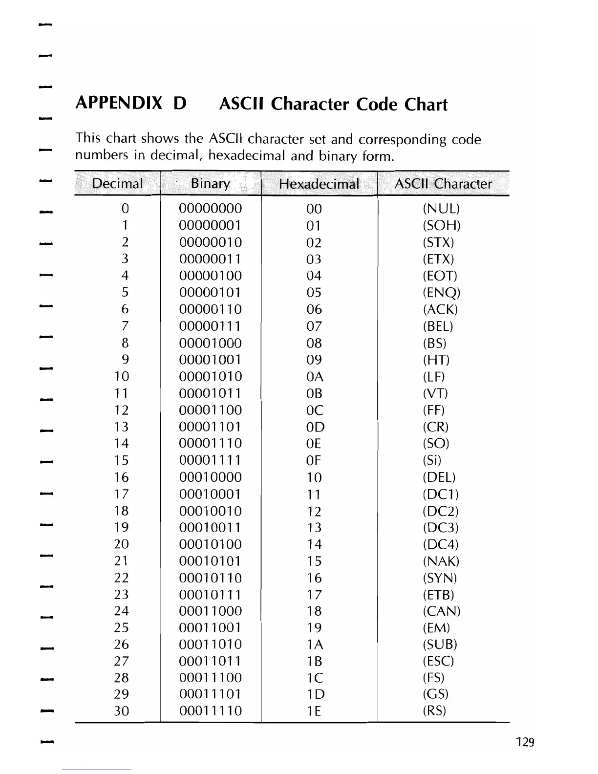 This chart shows the ASCII character set and