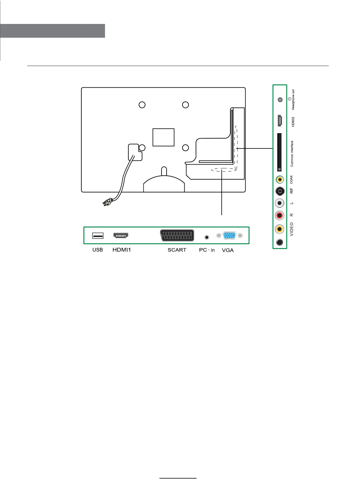 RF: Connect antenna or cable 75 Ohm coaxial to receive TV signal.
