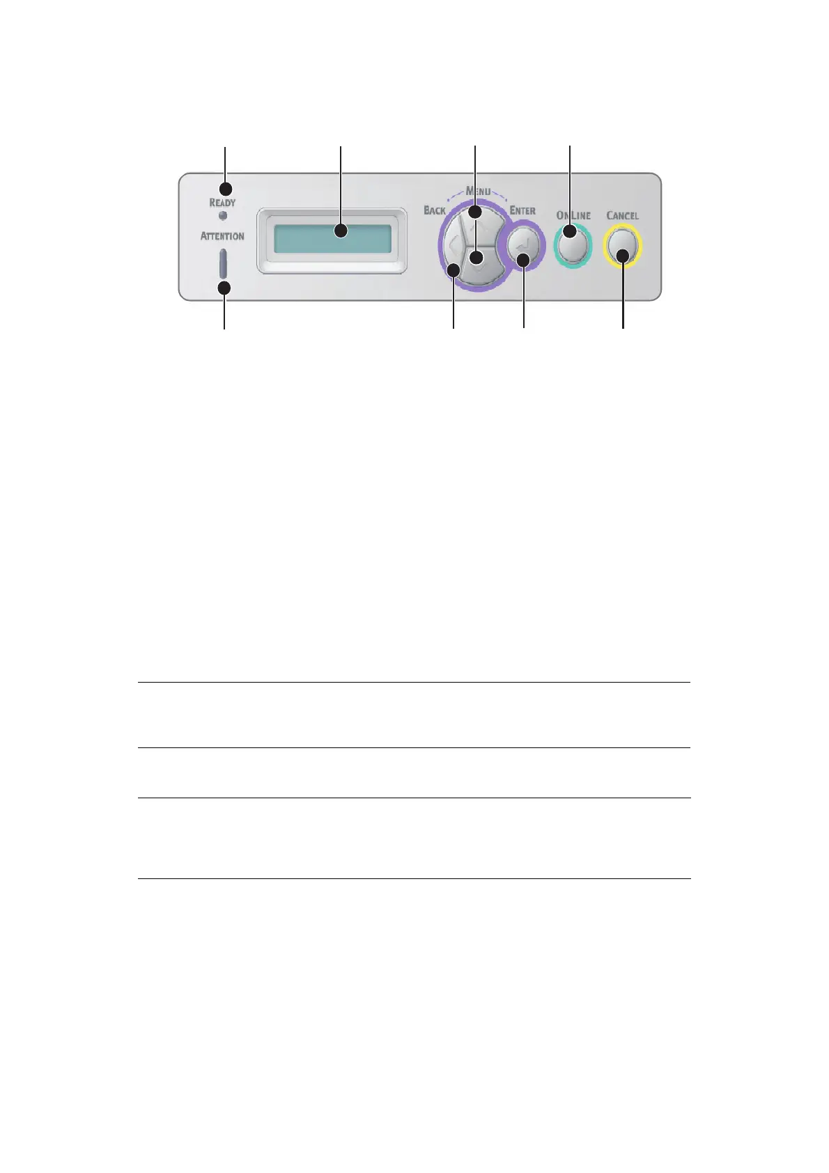 8. Attention indicator (red). ON indicates a warning (e.g. low toner). FLASHING