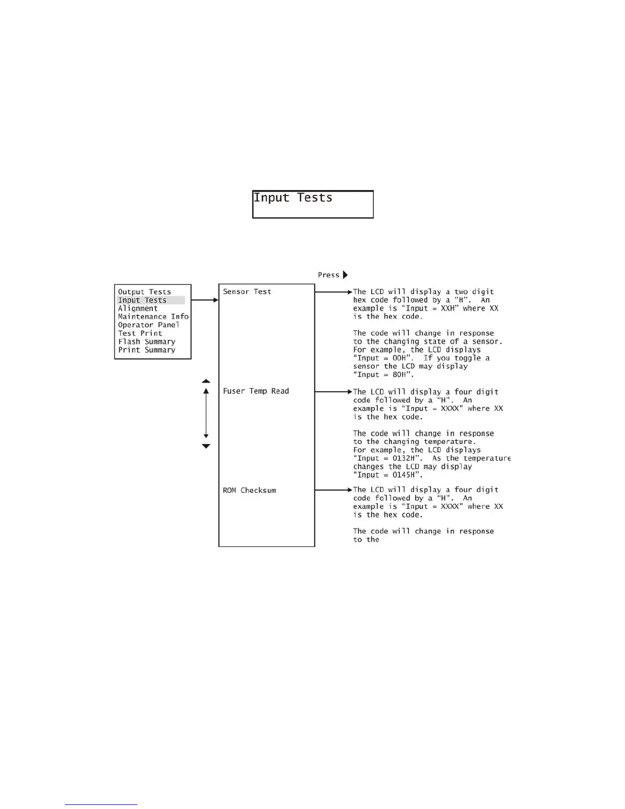 Input tests are used to test cover interlocks, paper path sensors, paper size switches, etc., fuser tem-