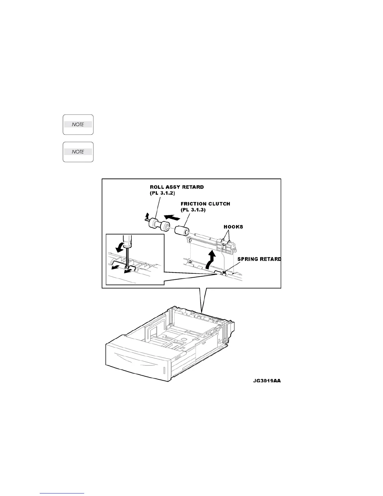 2) Release the hooks securing the HOLDER RETARD (PL 3.1) to the 550 PAPER CASSETTE using