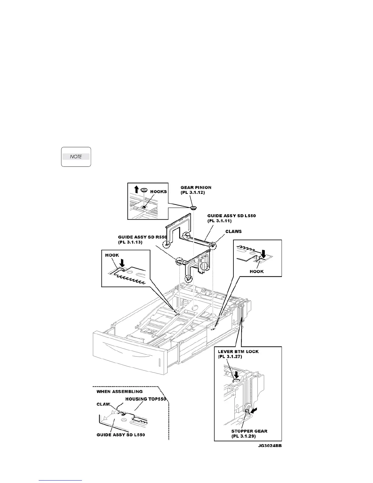 5) Slide the GUIDE ASSEMBLY SD L550 (PL 12.3) inward, and remove it from the HOUSING TOP