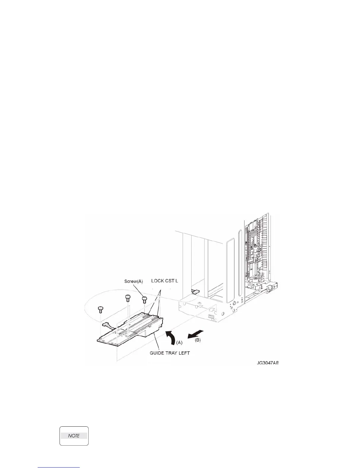 14) Shift the GUIDE TRAY LEFT in the direction of the arrows (A) and (B), and remove it from the