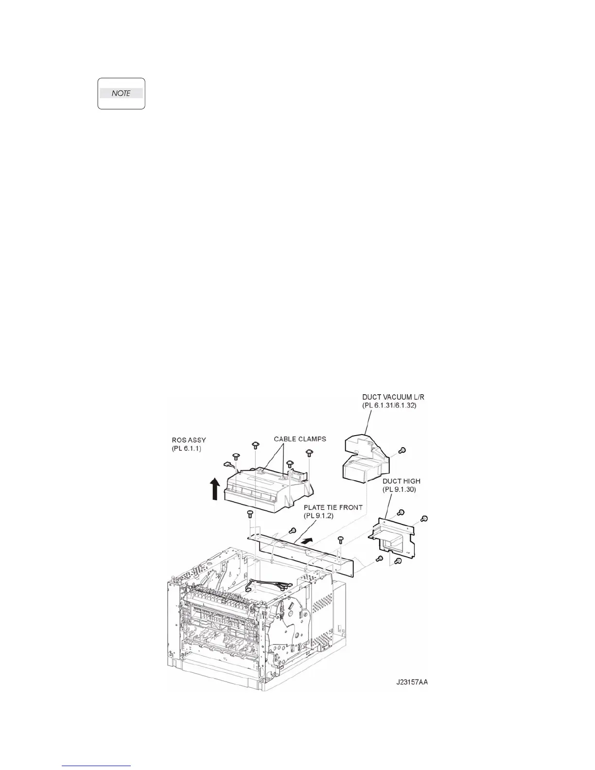 10) Remove the 3 screws (silver with flange, 8mm) securing the DUCT HIGH (PL 9.1), and remove the