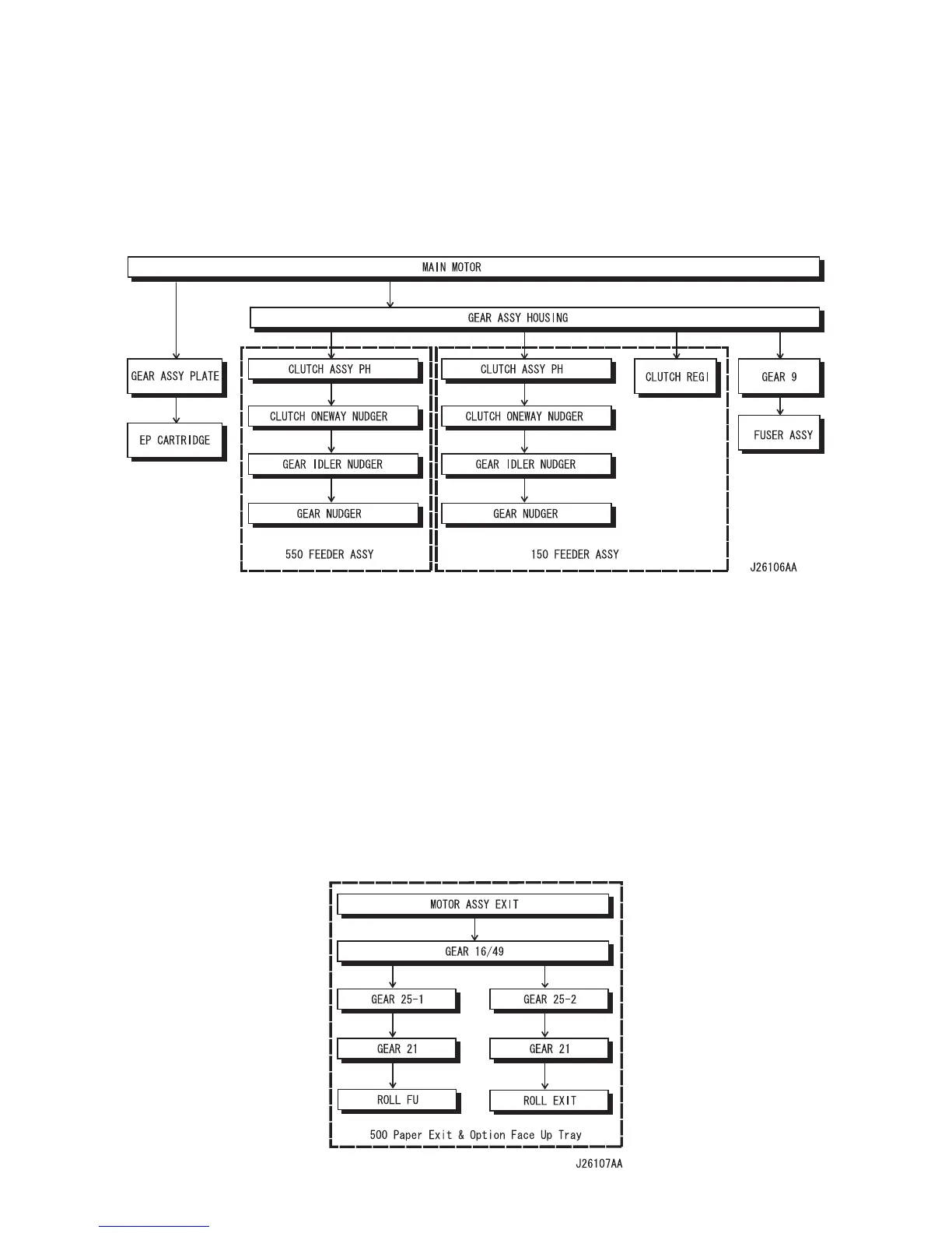 The rotating force of the MOTOR ASSY EXIT is transmitted via various gears to
