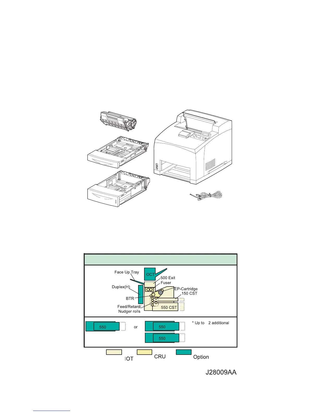 The basic printer consists of the print engine main unit, consumables (CRU), 150 Sheet Universal and