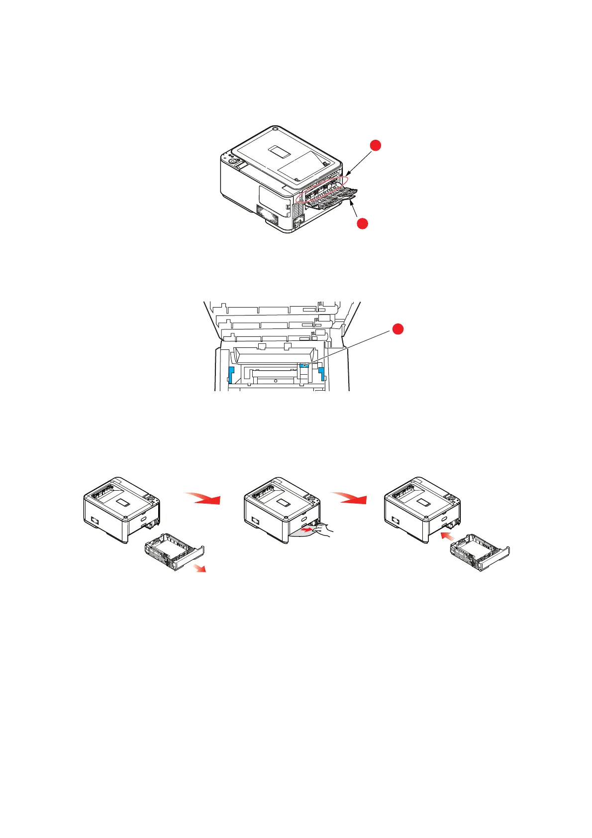 9. Open rear output tray (h) and check for a s