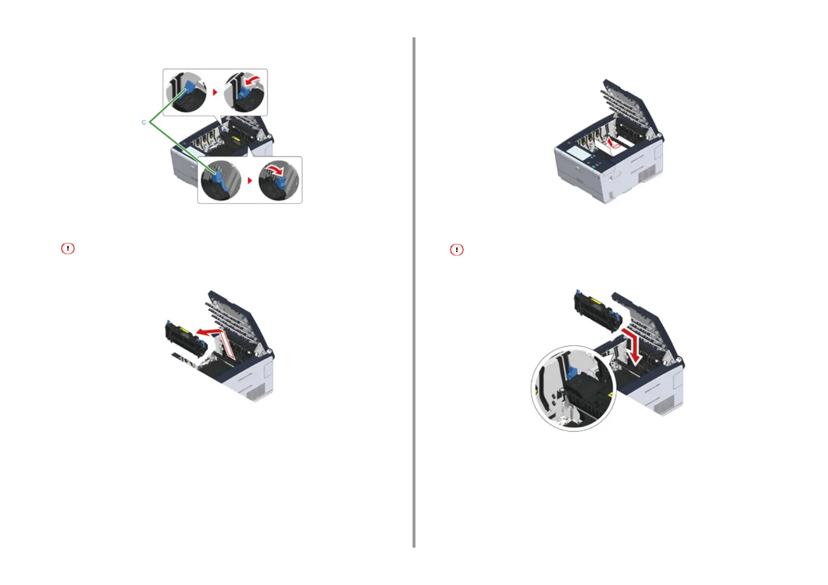 Tilt back the lock levers (c) on the both sides of the fuser unit toward you.
