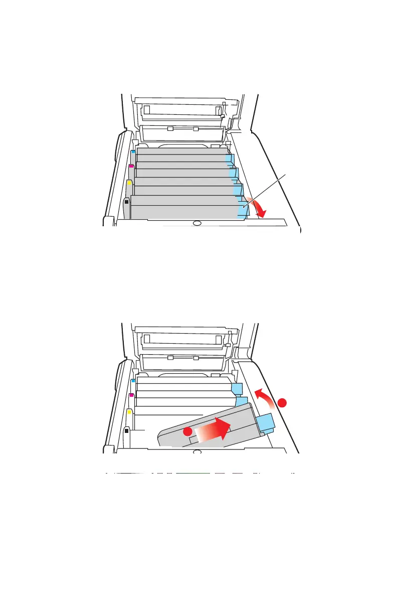 3. Pull the colored toner release lever on the cartridge to be