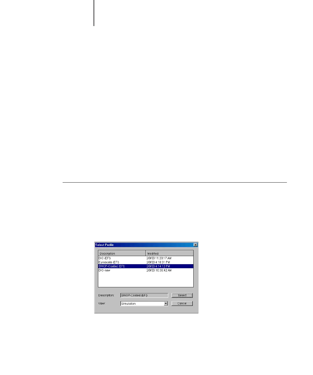 Simulation lists the simulation profiles resident on the Fiery, and Output lists the