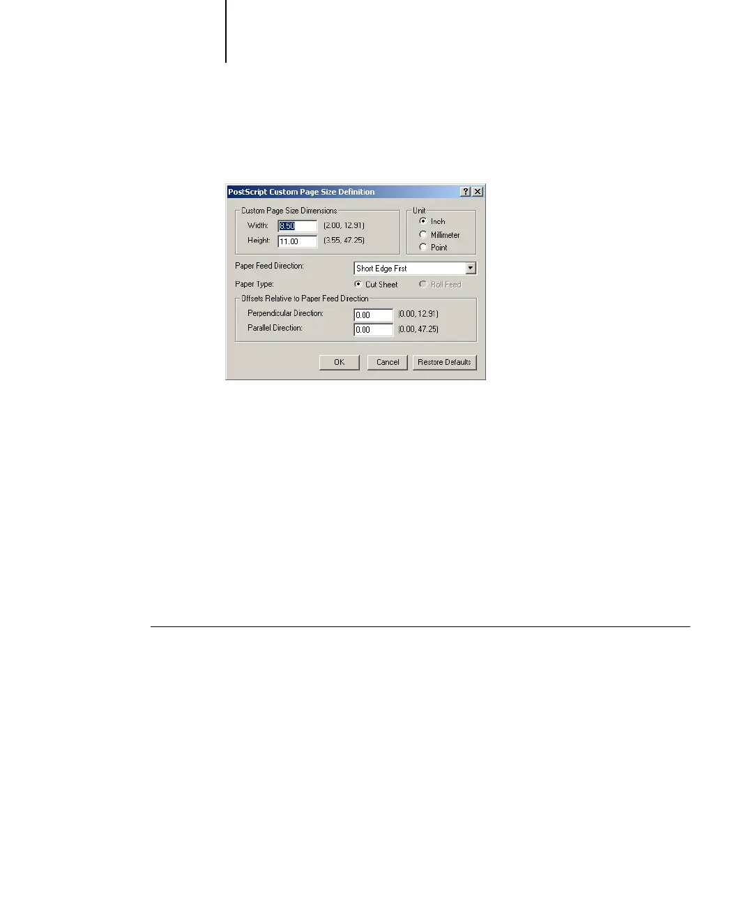 The PostScript Custom Page Size Definition dialog box appears.