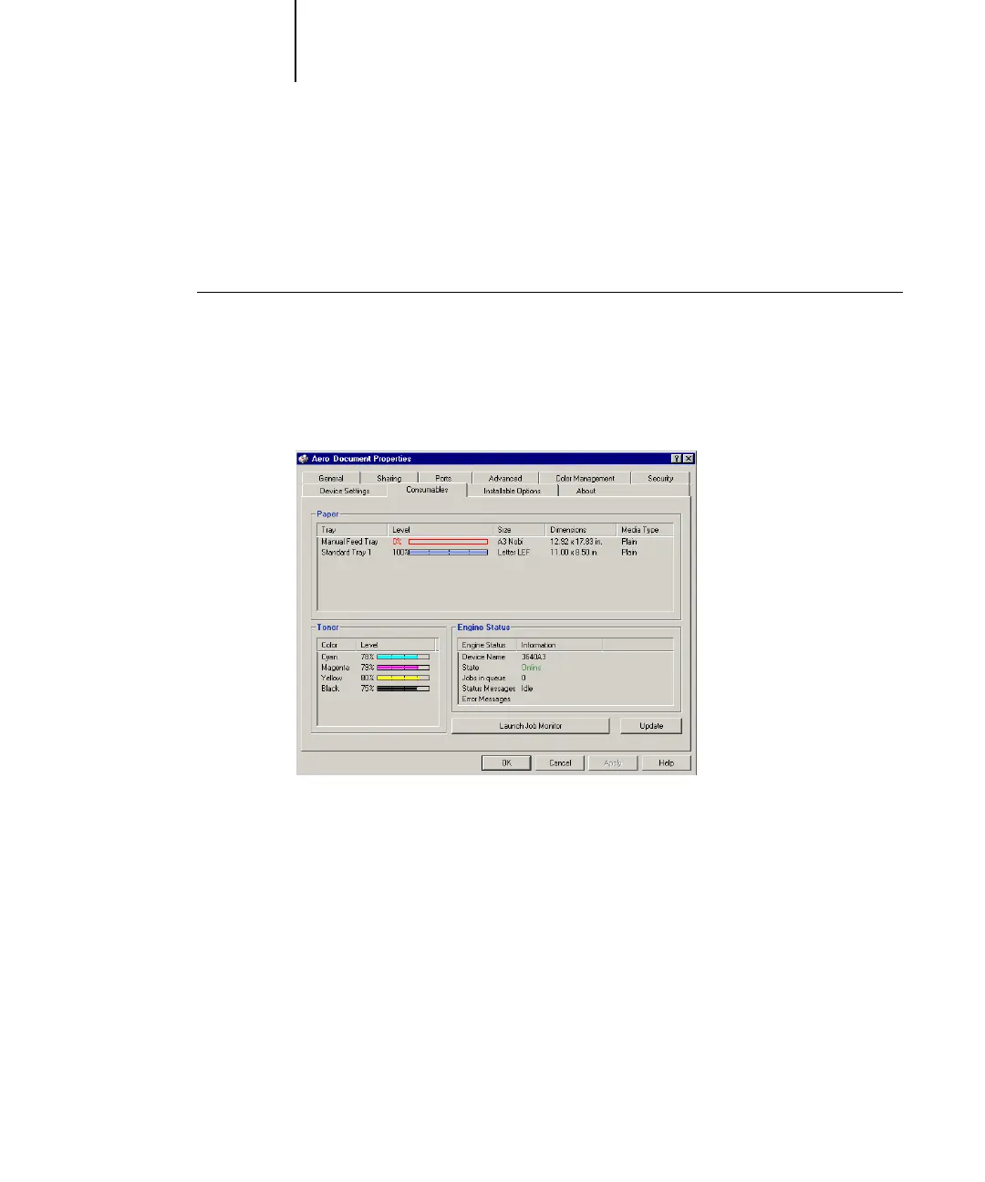 The status of the printer consumables can be viewed from the PostScript driver’s