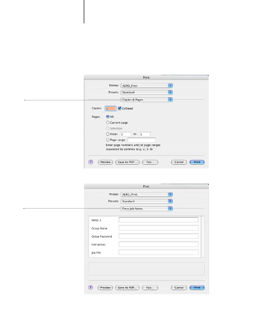 6. Select the Fiery as your printer and choose an option category from the menu that