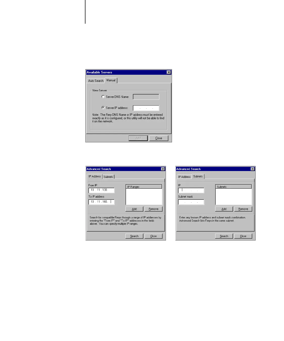 3. If no Fiery servers were found, click the Manual tab to search by DNS name