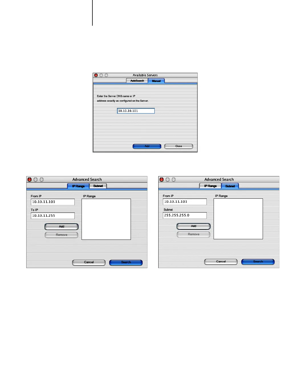 2. If no Fiery servers were found, click the Manual tab to search by DNS name or IP