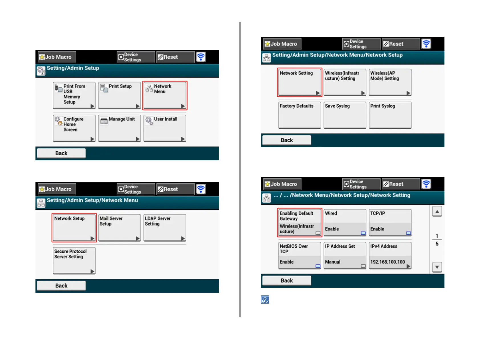 Pressing [Enabling Default Gateway] switches between [Wired] and [Wireless(Infrastructure)].