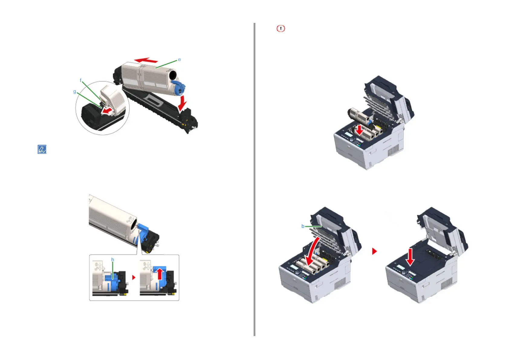 Insert a new toner cartridge (e) by aligning its left side indentation (f) with the