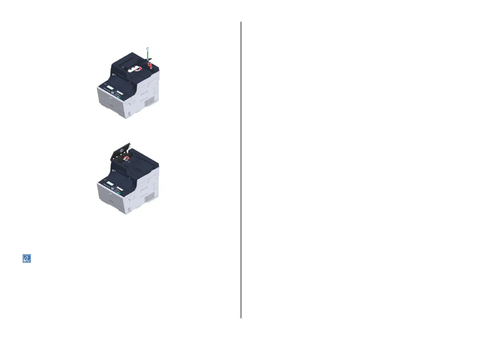 If the edge of document jammed under the document tray (c) can be seen, lift