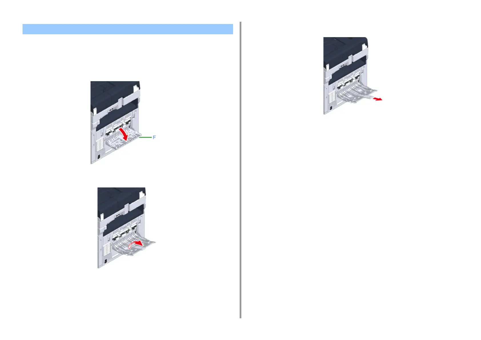 Open the rear output tray (F) on the rear side of the machine.