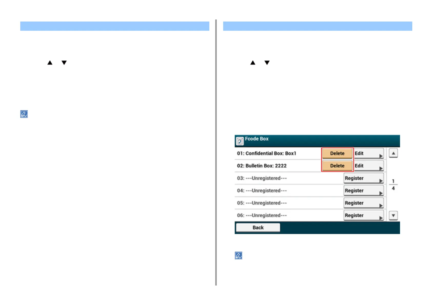 Deleting a Document in a Bulletin Board Box of This Machine Deleting a Registered Fcode Box