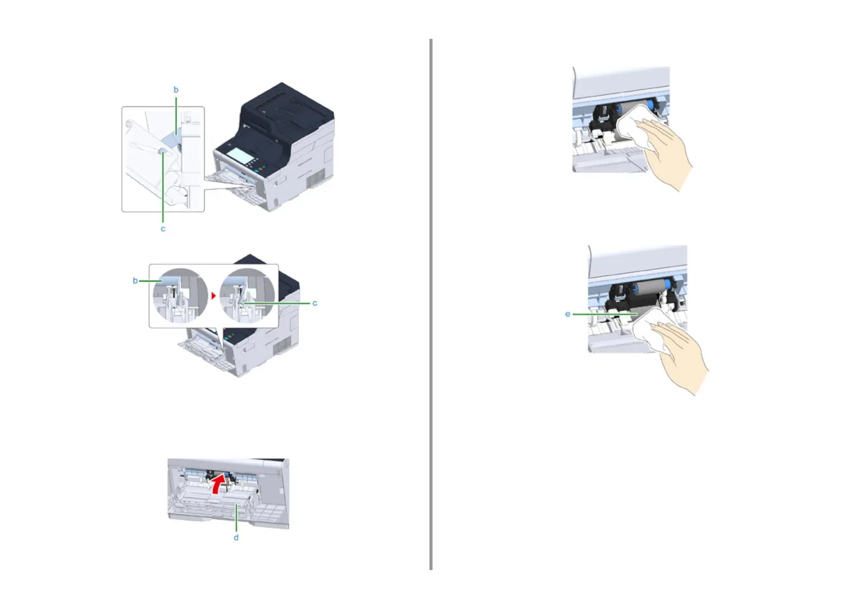 Keep pressing the center of the MP tray, wipe the separation roller (e) with a