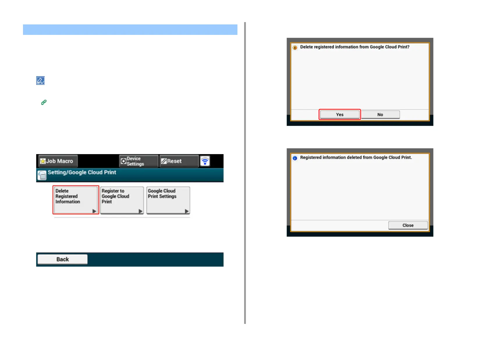 If you delete the information with the machine connected to a network, the registration information on the Google