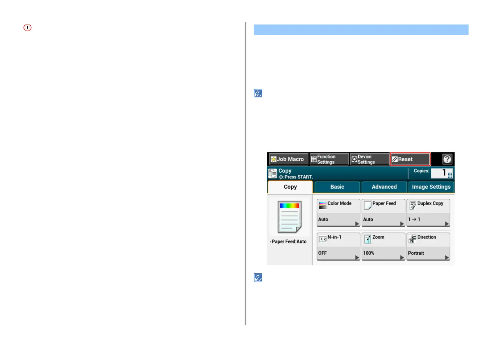 When copying is complete, press [Reset] to reset the default settings for the next user.