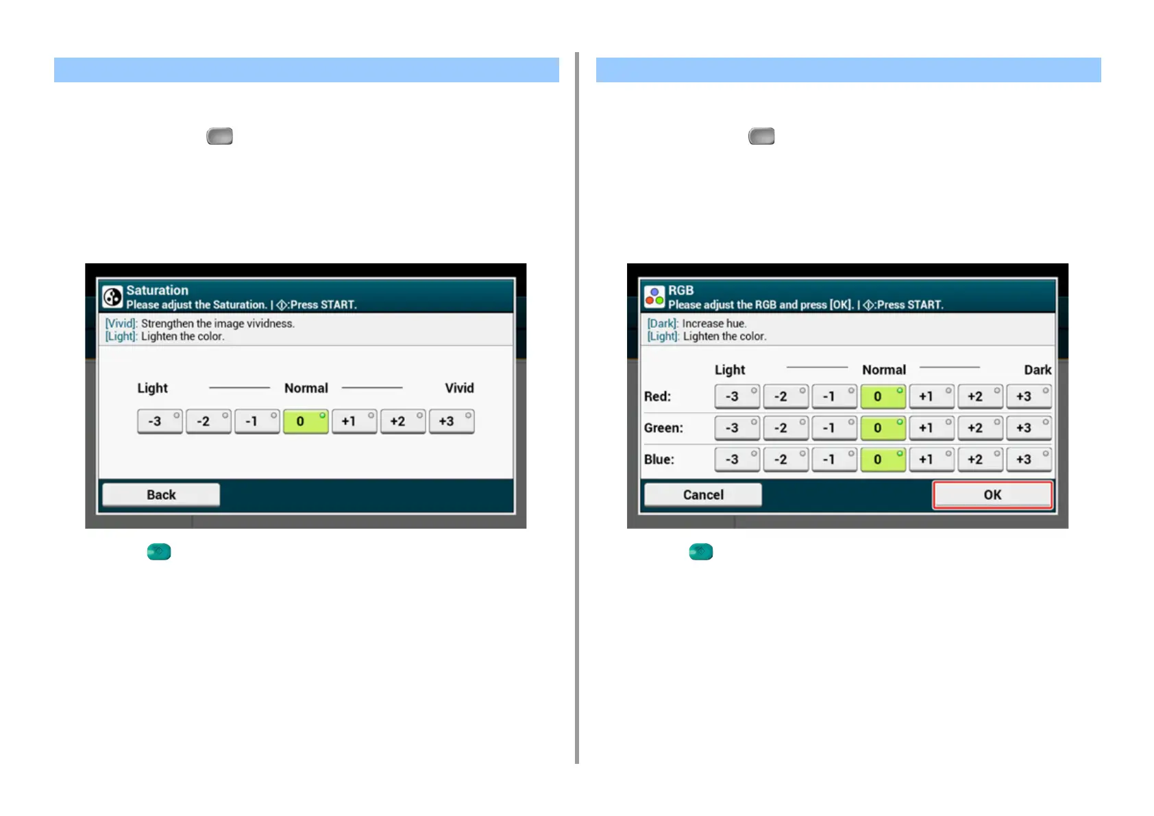 Saturation setting. Vivid: Enhance image sharpness. Light: Mute color.