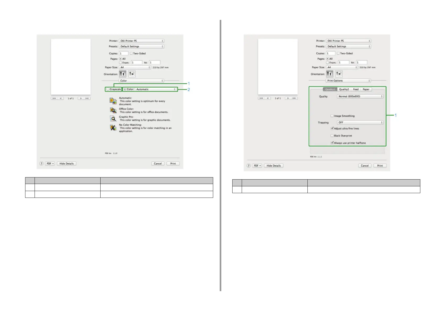 1 Quality1, Quality2, Feed, Paper Specifies the print quality, toner saving, paper type, etc.