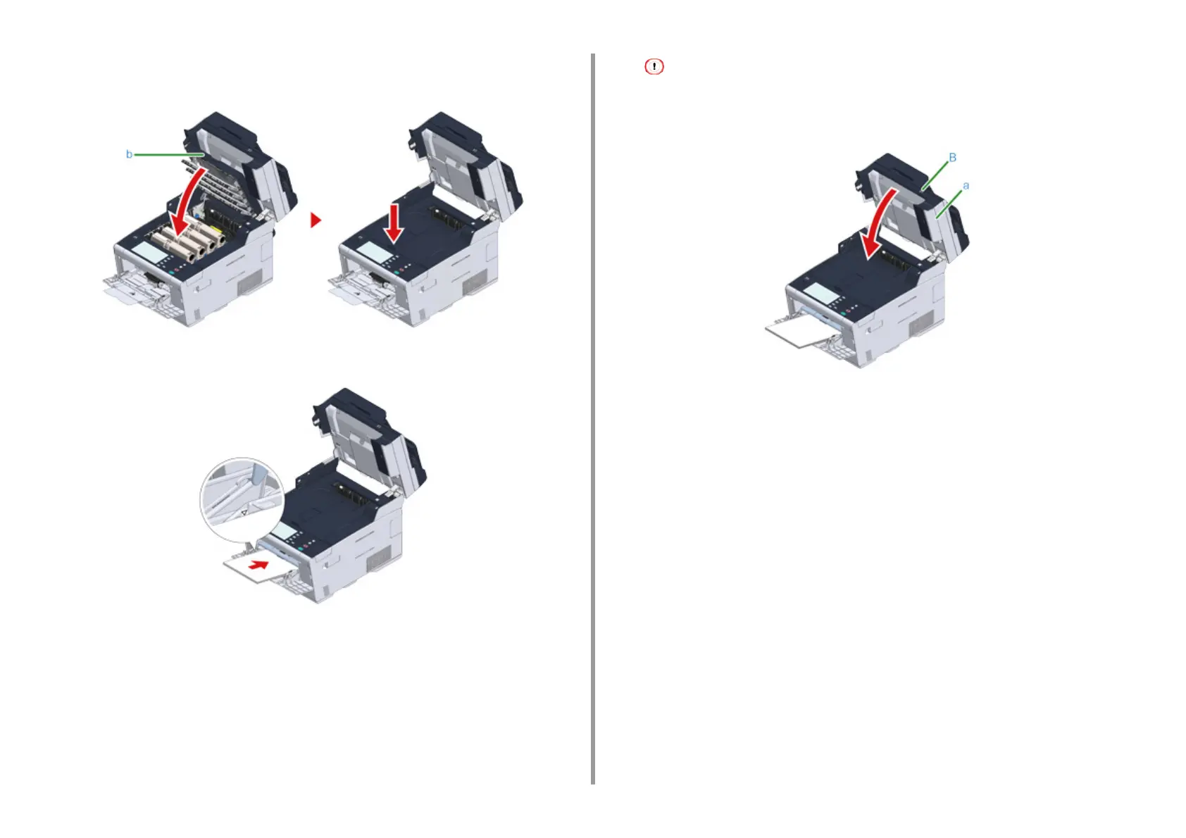 Close the output tray (b) slowly and push the center of the output tray for