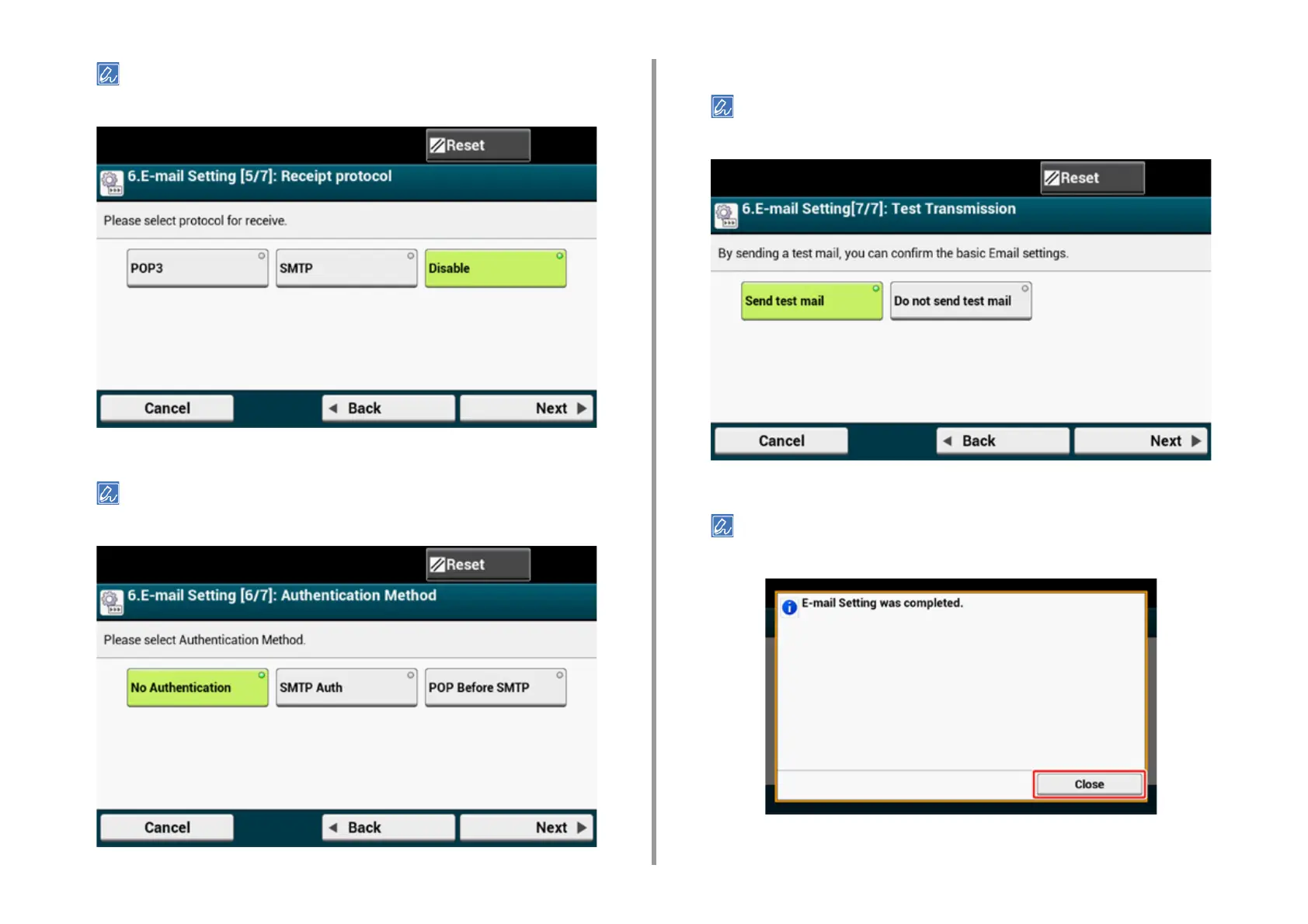 If [SMTP Auth] or [POP Before SMTP] is selected, enter the user name and password, and then press [Next].