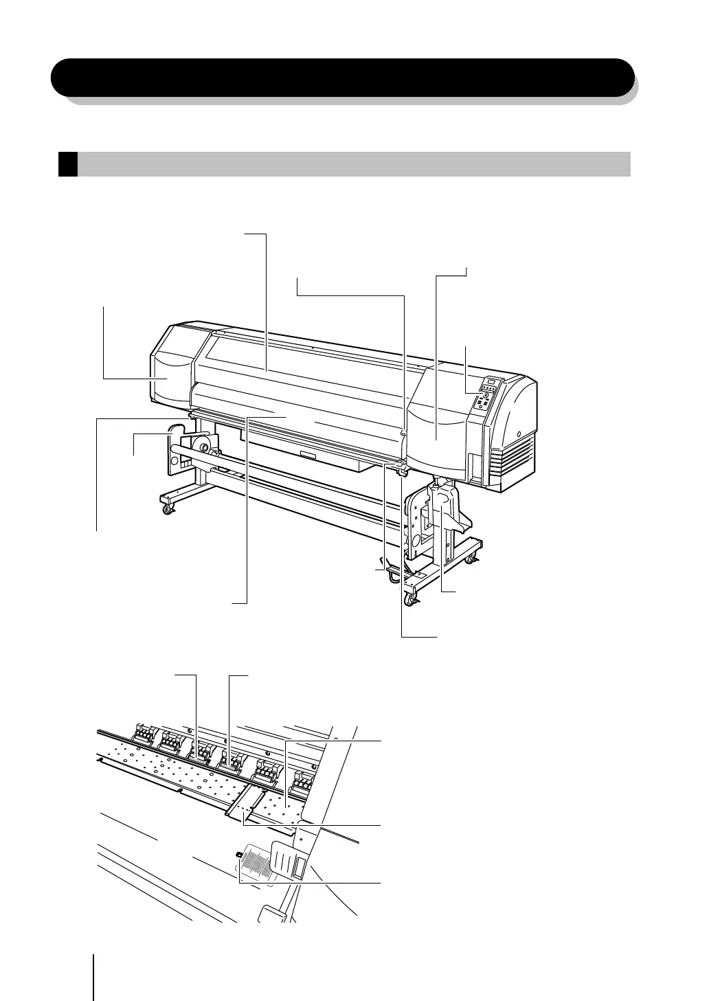 La stampante viene visualizzata con il nome e la funzione di ogni componente.