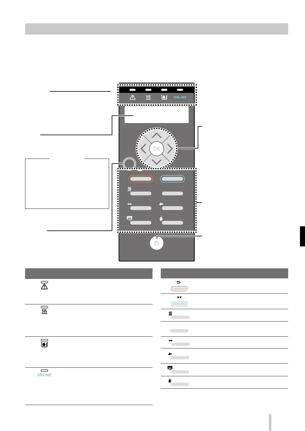 Los botones, los LED y la pantalla LCD se ubican en el panel de operaciones de la impresora según se muestra a con-